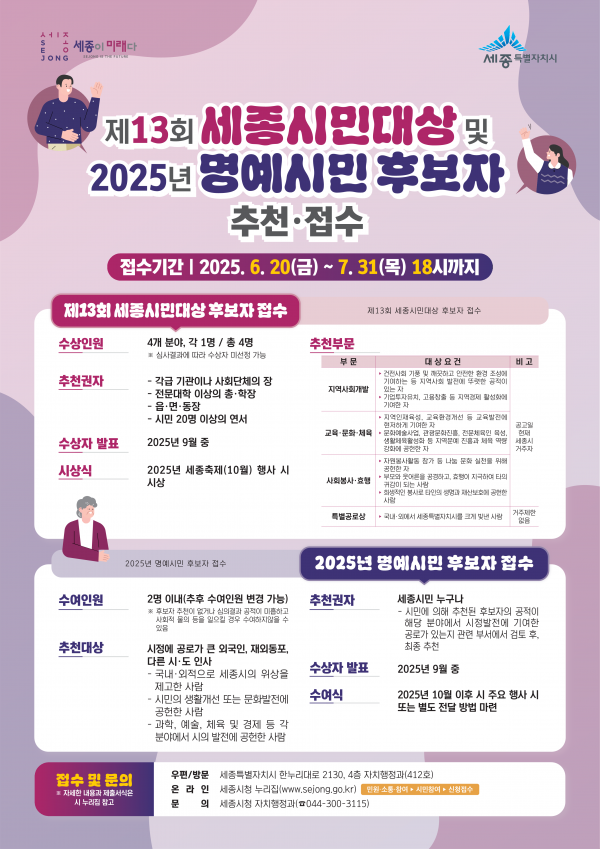 시는 20일부터 다음달 31일까지 ‘제13회 세종시민대상’과 ‘2025년 명예시민’ 후보자 접수를 진행한다.