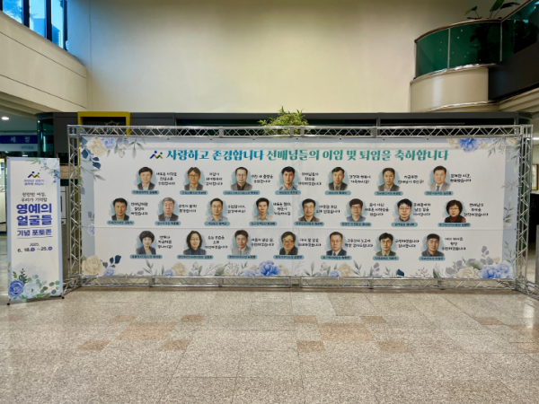 ‘영예의 얼굴들’ 전시는 퇴직 공무원 한 분 한 분의 특징을 살려 정성스럽게 그려낸 일러스트와 함께, 동료이자 후배 직원들의 간단한 응원 글도 함께 구성되어 있어 시민들에게도 감동과 공감을 자아낼 것으로 기대된다.