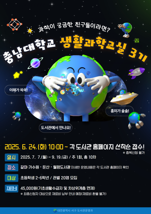 [Ytv영상스토리] 대전 서구는 오는 7월부터 갈마·가수원·둔산·월평 등 4개 공공도서관에서 지역 어린이들의 과학 창의력과 잠재력 향상을 위한 ‘2025 충남대학교 생활과학교실’ 제3기 프로그램을 운영한다고 밝혔다.