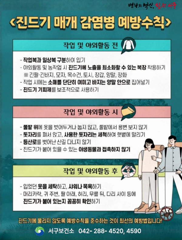 감염 예방을 위한 주요 수칙으로는 △긴 옷 착용 △해충 기피제 사용 △야외활동 후 즉시 샤워 및 세탁하기 등을 강조했다.