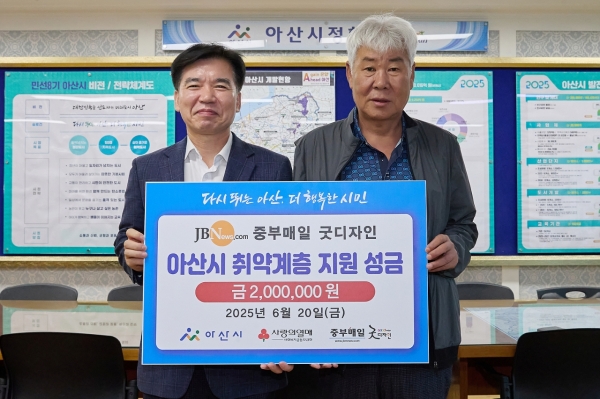 조일교 아산시 부시장은 “여름철 취약계층의 건강과 안전을 위해 시원한 마음을 보내주신 중부매일 굿디자인에 진심으로 감사드린다”며 “이번 성금으로 어르신들과 어려운 가정이 시원한 실내에서 편안한 여름을 보낼 수 있을 것”이라고 말했다.