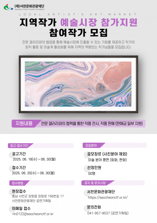 [Ytv영상스토리] 재단법인 서천문화관광재단은 지역 미술 작가의 창작 활동을 지원하고 예술 시장 진출 기회를 확대하기 위해 ‘2025 지역작가 예술시장 참가 지원’ 사업을 추진하고 이달 6월 30일까지 참여 작가를 공개 모집한다.