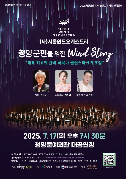 이번 ‘서울윈드오케스트라의 청양군민을 위한 윈드스토리’는 세계 최고의 관악 작곡가 필립 스파크의 오케스트라 연주와 소프라노 김순영, 클라리넷에 조인혁이 협연해 윈드오케스트라의 웅장함과 클래식의 다채로움을 관객들에게 선사할 것으로 기대된다.