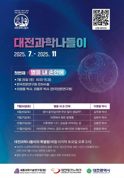 세종과학기술연구원 협동조합은 ‘대전 과학나들이’를 통해 매달 마지막 주 토요일 국립중앙과학관 등 대전 내 과학 명소에서 인공지능, 양자컴퓨터 등 최신 과학기술을 소개하고 시민들의 궁금증을 해소하는 강연 및 Q&A 토크쇼를 5회 진행한다.