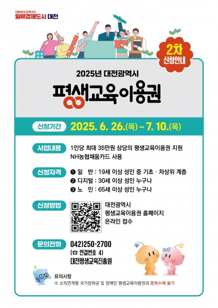 고현덕 대전시 교육정책전략국장은 “평생교육이용권이 시민의 자아실현과 역량 강화에 도움이 되기를 바라며 이를 통해 도시의 경쟁력도 높아질 것”이라며 “앞으로도 시민의 발전과 삶의 질 향상을 위한 정책을 지속 추진하겠다”고 말했다.