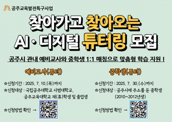 튜티는 공주시에 거주 중인 중학생을 대상으로 선착순 60명을 모집하며 오는 7월 30일까지 정보무늬를 통해 신청하면 된다.