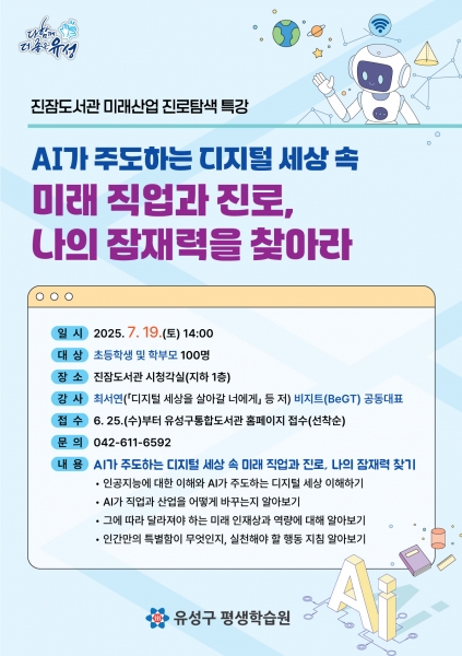 이번 강연은 대전시 교육발전특구 ‘미래산업 진로 탐색 독서아카데미’ 사업의 일환으로 마련됐으며 ‘디지털 세상을 살아갈 너에게’, ‘AI 질문이 직업이 되는 세상’ 등의 저자인 최서연 작가가 진행한다.
