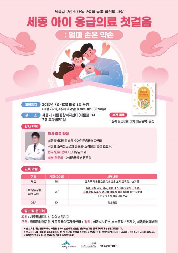 특히 세종충남대학교병원 소아전문응급의료센터 서정호 소아청소년과 전문의가 강사로 나서 전문적이고 신뢰도 높은 정보를 제공한다.