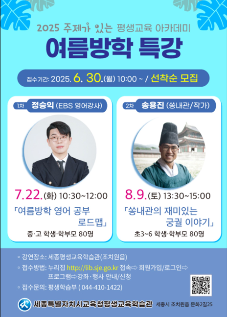 [Ytv영상스토리] 세종시교육청평생교육학습관은 6월 30일부터 ‘2025 여름방학 평생교육 아카데미 특강’ 수강생을 모집한다.