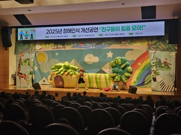 [Ytv영상스토리] 대전 서구는 지난 27일 구청 구봉산홀에서 관내 어린이집 원아 400여명을 대상으로 장애 인식 개선 뮤지컬 인형극 ‘친구들이 힘을 모아’를 2회에 걸쳐 공연했다고 밝혔다.