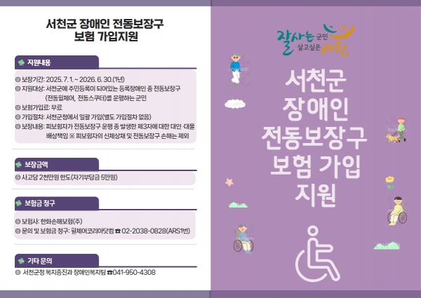 지원 대상은 서천군에 주민등록을 두고 전동휠체어나 전동스쿠터를 이용하는 등록 장애인으로 별도의 신청 절차 없이 자동으로 보험에 가입돼 혜택을 받을 수 있다.