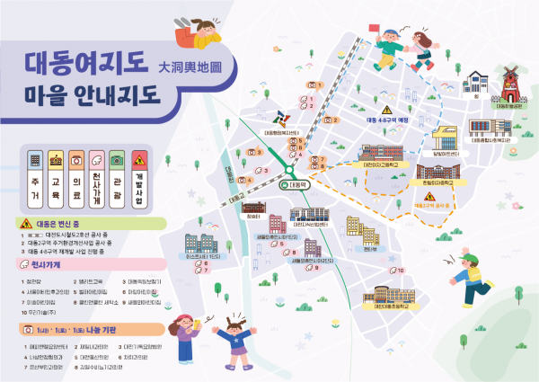 지도에는 △‘111 나눔’ 사업 참여기관과 천사가게 △대동역, 관내 학교, 300세대 이상 아파트 △행정복지센터, 대동종합복지관 등 주요 공공시설이 보기 쉬운 일러스트 형태로 표시됐으며 대전도시철도 2호선 공사 구간과 대동2구역 및 대동4·8구역 등 주요 개발 현황도 함께 수록됐다.