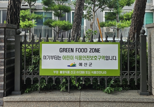 군은 어린이 식품안전보호구역 신규 지정에 따라 해당 구역이 누구나 쉽게 인지할 수 있도록 예산족구장1, 예산발연계룡리슈빌아파트 정문과 정문 맞은편 등 총 3곳에 어린이 식품안전보호구역 안내 표지판을 설치했다.