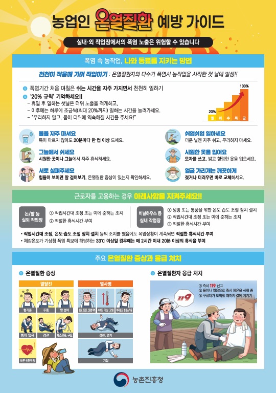 온열질환은 자칫 생명을 위협할 수 있는 위험한 질환으로 탈진 및 열사병 등 중증으로 이어질 수 있기에 여름철 농작업 시에는 다음과 같은 ‘농작업 안전수칙’을 준수해야 한다.