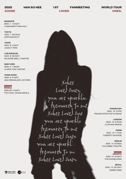 소속사 9아토엔터테인먼트에 따르면, 한소희는 9월 13일 마닐라, 10월 18일 자카르타에서 ‘2025 HAN SO HEE 1st FANMEETING WORLD TOUR [Xohee Loved Ones,]’를 추가 개최하고 현지 팬들을 만난다.