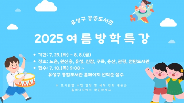 정용래 유성구청장은 “도서관에서 진행되는 방학 특강이 아이들에게 책·놀이·배움이 어우러진 유익한 시간을 보내길 바란다”며 “도서관을 중심으로 아이들이 책과 함께 즐길 수 있는 배움의 기회를 마련하겠다”고 말했다.