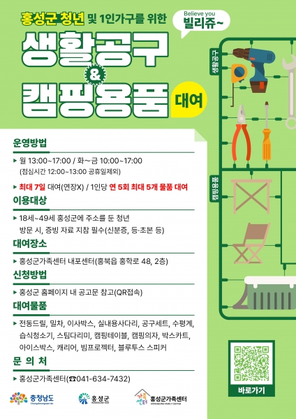 사업추진을 위해 군은 지난달 4일 홍성군가족센터와 업무협약을 체결했고 물품관리 및 대여·반납절차 등 공구 대여 서비스 운영에 있어서 상호 협력할 예정이다.