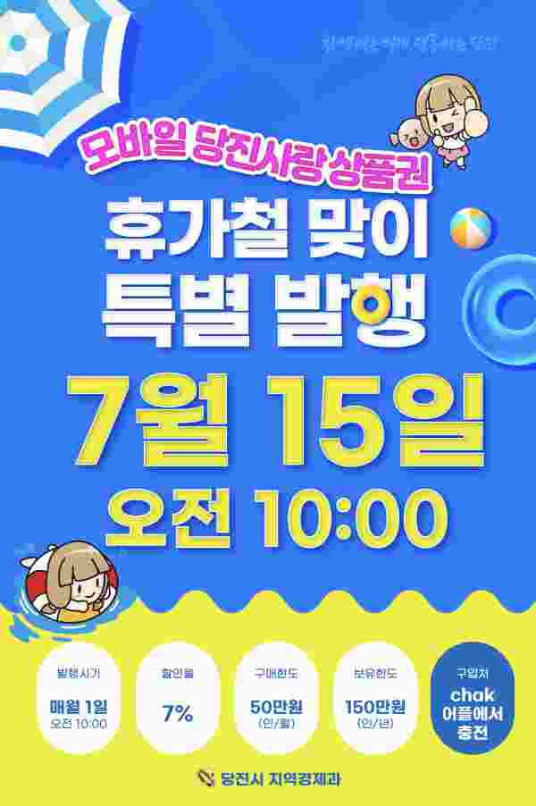 [Ytv영상스토리] 당진시가 본격적인 휴가철을 맞이해 매월 1회 발행하던 모바일 당진사랑상품권을 7월 한 달간 50억원을 추가로 15일 오전 10시 특별 발행한다.