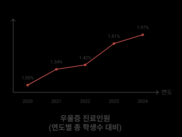 같은 기간 전체 학생 수는 약 15% 증가에 그친 반면, 우울증 진료 인원은 115% 이상 급증해 정서적 위기를 겪는 아동·청소년이 빠르게 확산되고 있음을 보여준다.