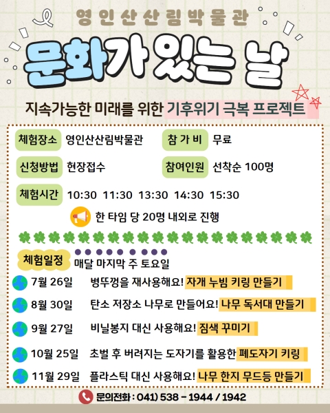 [Ytv영상스토리] 아산시시설관리공단 영인산산림박물관은 매월 마지막 주 토요일 기후위기를 주제로 한 다양한 체험 프로그램을 진행하는 ‘문화가 있는 날’ 행사를 운영한다고 밝혔다.