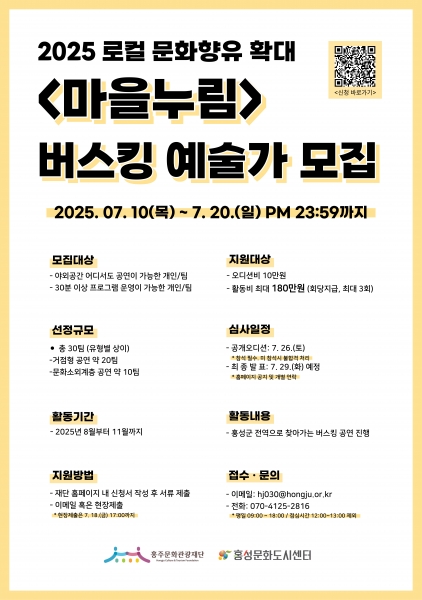 [Ytv영상스토리] 홍주문화관광재단은 오는 20일까지 ‘2025 로컬 문화향유 확대 ‘마을누림’’ 거리예술가를 공개 모집한다.