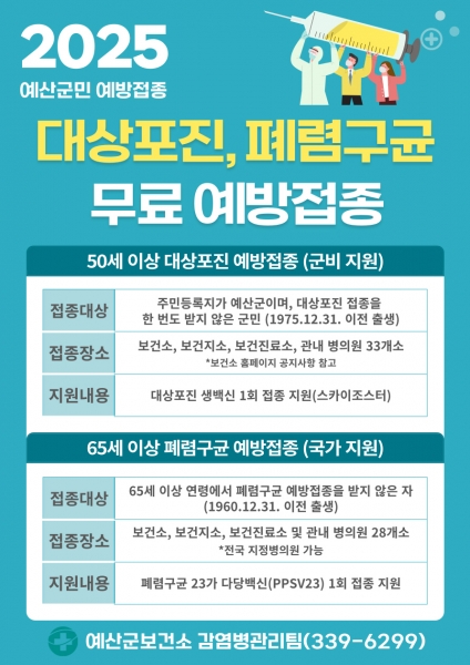 군은 올해 50세 이상 군민을 대상으로 대상포진 예방접종과 65세 이상을 위해 폐렴구균 예방접종을 전액 무료로 지원하고 있다.