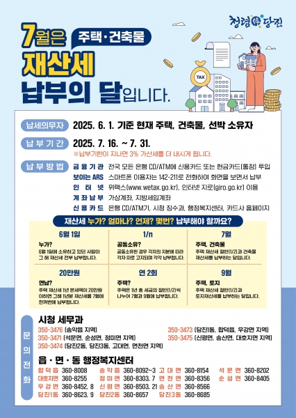 시 관계자는 “재산세는 지역발전과 시민 복지 증진을 위한 중요한 재원”이라며 “납부 기한 이후에는 3%의 납부 지연 가산세가 추가되므로 불이익을 받지 않도록 반드시 7월 31일까지 납부하기 바란다”고 당부했다.