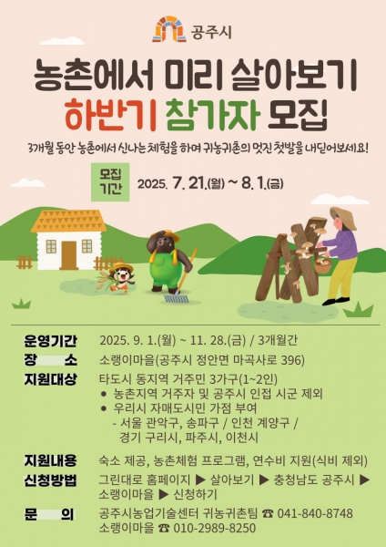 [Ytv영상스토리] 공주시는 예비 귀농·귀촌인이 농촌 생활을 직접 체험하며 미래를 준비할 수 있도록 돕는 ‘농촌에서 미리 살아보기’ 프로그램의 하반기 참가자를 오는 8월 1일까지 모집한다고 밝혔다.