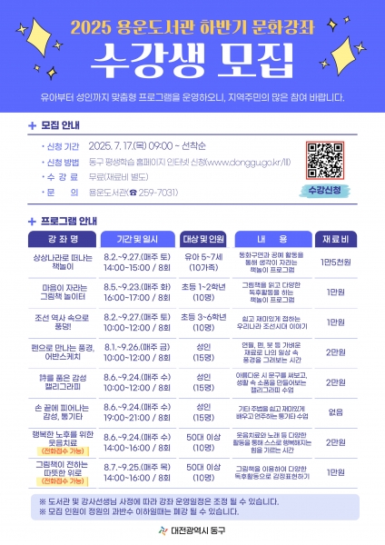 [Ytv영상스토리] 대전 동구는 오는 17일부터 31일까지 용운도서관 ‘하반기 문화강좌’ 수강생을 선착순 모집한다고 밝혔다.