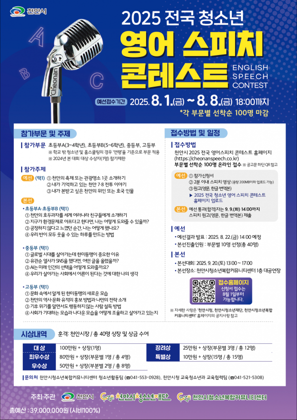 천안시, ‘2025 전국 청소년 영어 스피치 콘테스트’ 참가자 모집
