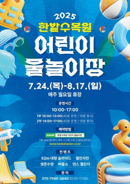이번 물놀이장은 엑스포시민광장에 대형 워터슬라이드, 풀장 등 다양한 물놀이 기구가 설치되며 어린이와 보호자 모두가 즐길 수 있는 레크리에이션, 생존수영 교육 등 프로그램도 함께 마련된다.