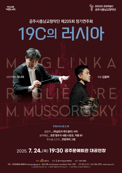 정나라 지휘자의 지휘 아래, 호른 연주자 김홍박과 공주시충남교향악단이 함께하는 이번 무대는 19세기 러시아 음악의 진수를 담아내어 강렬한 음색과 생생한 이야기로 살아 숨 쉬는 클래식 세계로 관객을 초대한다.