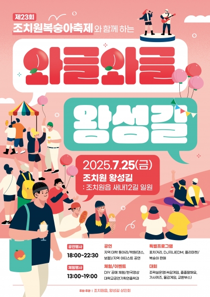 [Ytv영상스토리] 세종시 조치원읍이 오는 25일 오후 1시부터 조치원 왕성길 일원에서 세종 조치원복숭아 축제의 시작을 알리는 ‘2025 와글와글 왕성길 축제’를 개최한다.