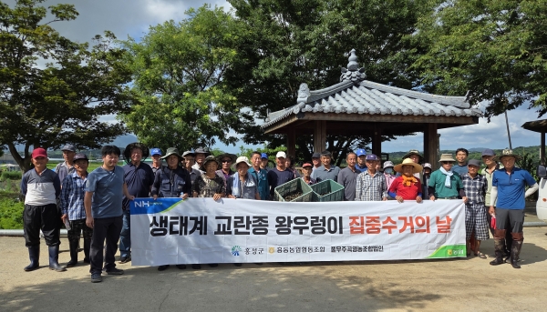 이번 행사에는 지역 농업인, 홍동농협 및 풀무주곡영농조합법인 친환경벼 작목반 등 약 40여명이 참여했으며 논과 수로 주변에서 왕우렁이를 직접 수거하고 관리하는 시간을 가졌다.
