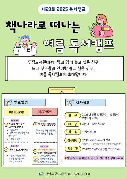 프로그램은 초등학교 4~6학년 24명을 대상으로 운영되며 참여 신청은 오는 7월 24일 오전 10시부터 천안시 도서관 누리집에서 하면 된다.