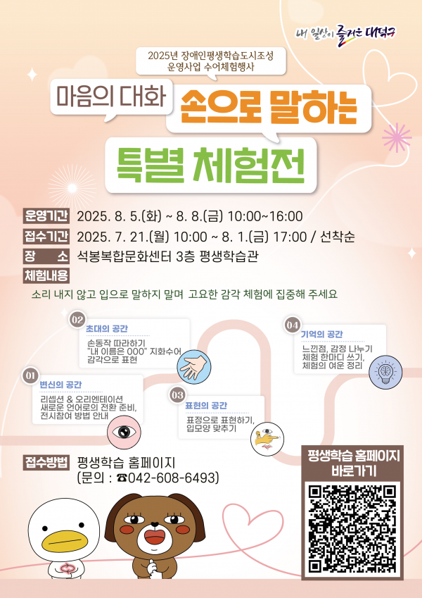 최충규 대덕구청장은 “이번 체험전이 수어와 농문화에 대한 이해를 높이고 장애 공감 문화와 긍정적 인식을 확산하는 계기가 되길 바란다”며 “앞으로도 장애인과 비장애인 모두가 함께 배울 수 있는 평생학습 도시 대덕구를 만들어가겠다”고 말했다.