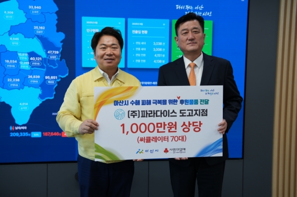 [Ytv영상스토리] 아산시는 파라다이스 스파 도고로부터 최근 집중호우로 피해를 입은 이재민들을 위한 1,000만원 상당의 써큘레이터 70대를 후원받았다.