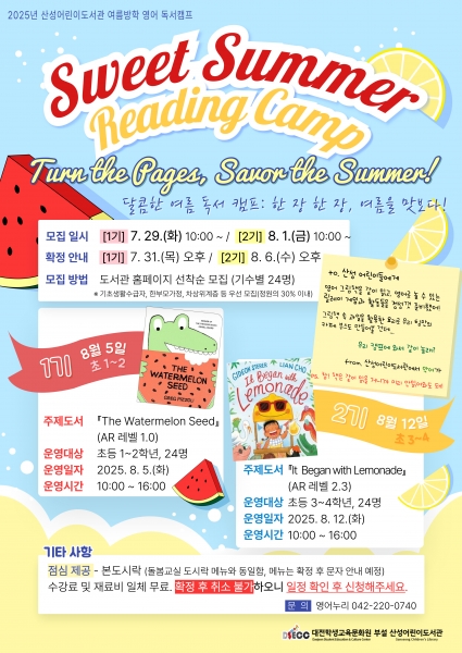 이번 캠프는 ‘달콤한 여름 독서캠프’를 주제로 학년별 영어 독서 수준을 고려해 1기는 8월 5일 2기는 8월 12일에 운영하며 오전 10시부터 오후 4시까지 진행된다.