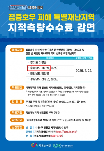 조주형 서산시 토지관리과장은 “집중호우 피해로 토지 경계가 모호해지는 등 지적측량이 필요해질 것으로 보인다”며 “이번 수수료 감면이 집중호우 피해를 본 시민의 경제적 부담 완화에 기여하길 바란다”고 말했다.