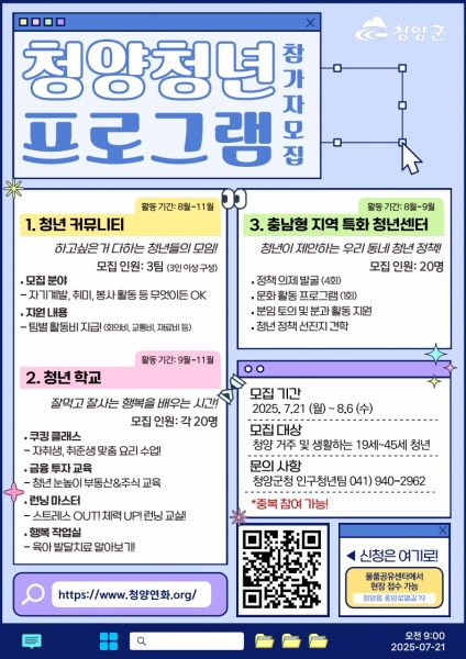 [Ytv영상스토리] 청양군은 지역 청년들의 소통과 성장을 지원하고 청년들이 직접 지역문제를 고민하며 정책을 제안할 수 있도록 돕는 다양한 참여 프로그램을 8월부터 본격 추진한다고 밝혔다.