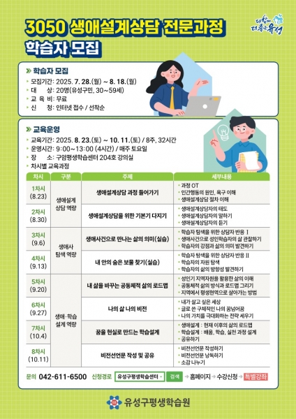 이번 강좌는 생애설계와 학습설계에 관심 있는 30~50대 유성구민을 대상으로 오는 8월 23일부터 10월 11일까지 매주 토요일마다 운영될 예정이다.