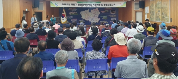특히 야외 활동이 많은 공공일자리 참여자들이 폭염 속 건강을 지키고 안전하게 업무를 수행할 수 있도록 체계적인 온열질환 예방수칙을 중심으로 구성됐으며 참여자의 대부분이 고령층인 점을 고려해 △고온 환경에서의 신체 변화 △탈수 증상 및 대처법 △그늘 휴식과 수분 섭취의 중요성 등에 대해 상세히 안내하며 실질적인 대응 능력을 높이는 데 중점을 뒀다.
