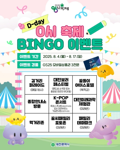 [Ytv영상스토리] 대전시는 오는 8일부터 16일까지 9일간 개최되는 ‘2025 대전 0시 축제’현장 방문객을 대상으로 ‘프로그램 BINGO’ SNS 이벤트를 진행한다고 4일 밝혔다.
