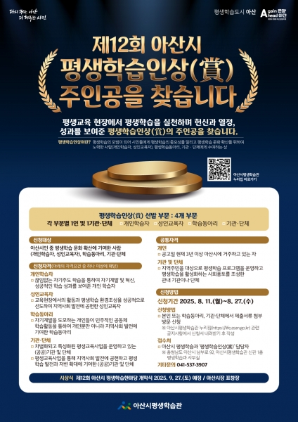 아산시 평생학습인상은 아산시민 중 평생학습 문화 확산에 기여한 개인학습자, 성인교육자, 학습동아리, 기관단체’ 4개 부문을 대상으로 한다.