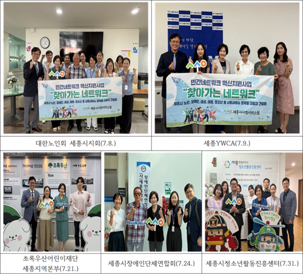 이번 사업은 △대한노인회 세종시지회 △세종YWCA △초록우산어린이재단세종지역본부 △세종시장애인단체연합회 △세종시청소년활동진흥센터을 직접 방문해 현장의 목소리를 듣고 협력 방향을 모색하기 위해 마련됐다.