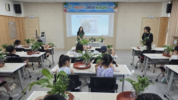 또한, 어린이원예교실 프로그램은 도시농업관리사에게 듣는 △탄소중립 이야기 △재활용 소재 활용 이야기 △수경식물 화분 만들기 실습으로 진행됐다.
