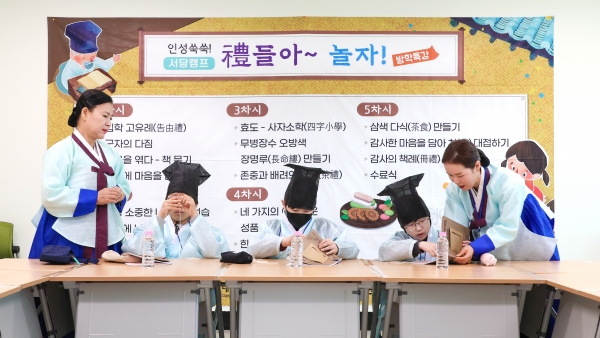 참여 학생들은 도포와 유건 등 전통 복식을 갖춰 입고 입학 고유례를 시작으로 서당 캠프의 문을 연다.