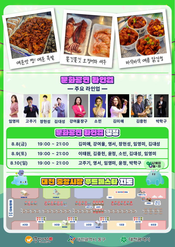 ‘중앙시장 푸드페스타’는 대전 대표 축제인 ‘대전 0시축제’ 와 연계해 진행되는 행사로 전통시장을 찾는 시민과 관광객에게 대전만의 맛과 정취, 그리고 이색적인 야간 콘텐츠를 선사할 예정이다.