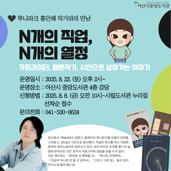 [Ytv영상스토리] 아산시립도서관이 23일 오후 2시, 중앙도서관에서 청년 대상 인문학 특강 ‘루나파크 홍인혜 작가와의 만남-N개의 직업, N개의 열정’을 운영한다.
