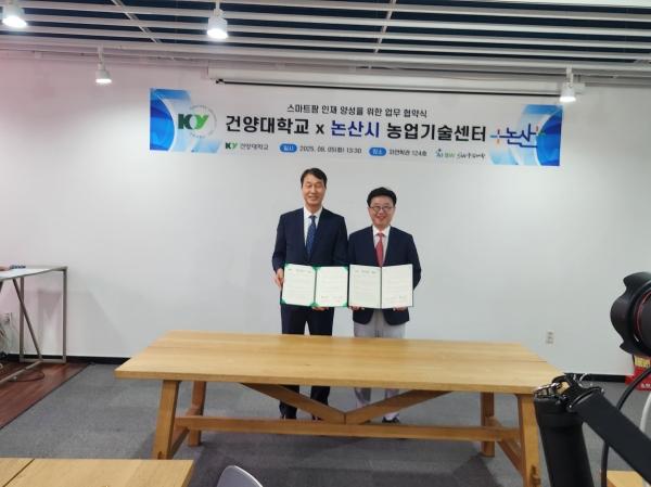 양 기관은 딸기향테마공원 내 유휴 공간을 스마트농업 실습·교육 복합공간으로 조성하고 이를 기반으로 △스마트농업 교육 프로그램 공동 개발·운영 △농업기술센터 교육생-건양대 학생 간 실습 교류 △지역 맞춤형 스마트농업 기술 공동연구 등 다양한 분야에서 협력한다.